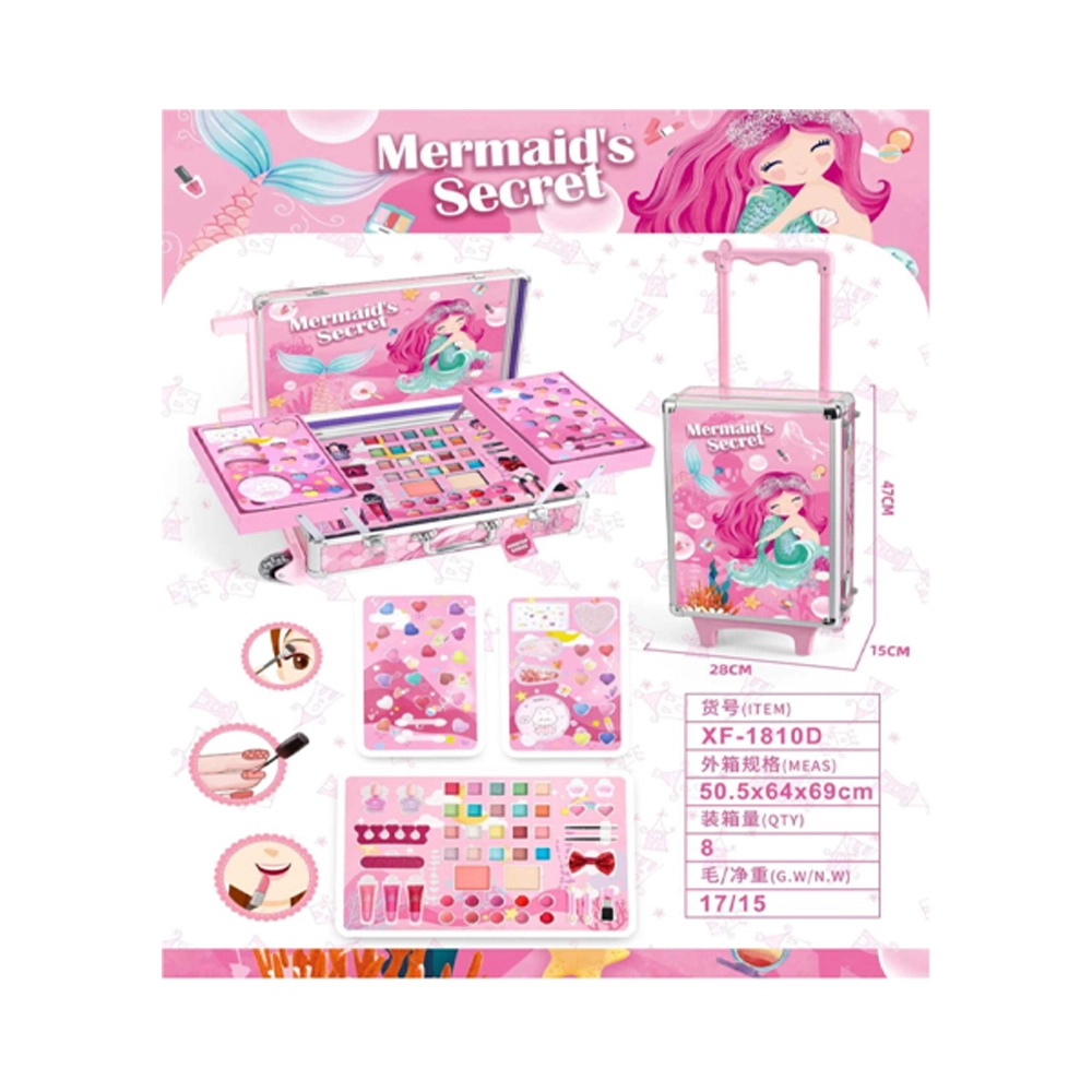 Unleash your child’s creativity with this enchanting “Mermaid’s Secret” makeup trolley, the ultimate all-in-one beauty kit for any aspiring young makeup artist! This beautifully designed pink rolling case opens up to reveal a treasure trove of colorful cosmetics, perfect for hours of imaginative play, makeovers, and dress-up fun. The convenient travel-friendly design means the glamour can go wherever they do!