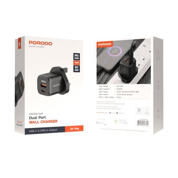 Porodo GaN Dual Port Wall Chargre with Type-C Cable 1.2 Black