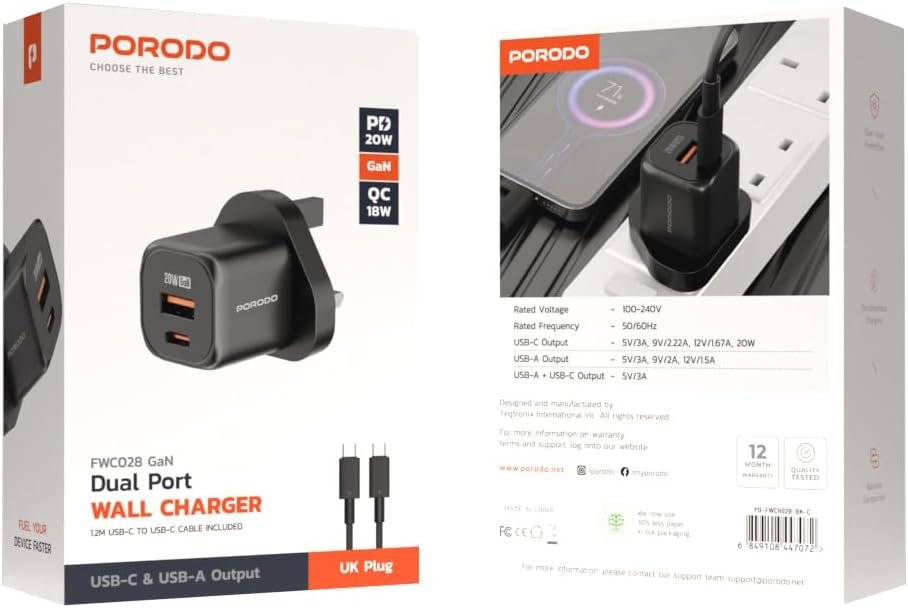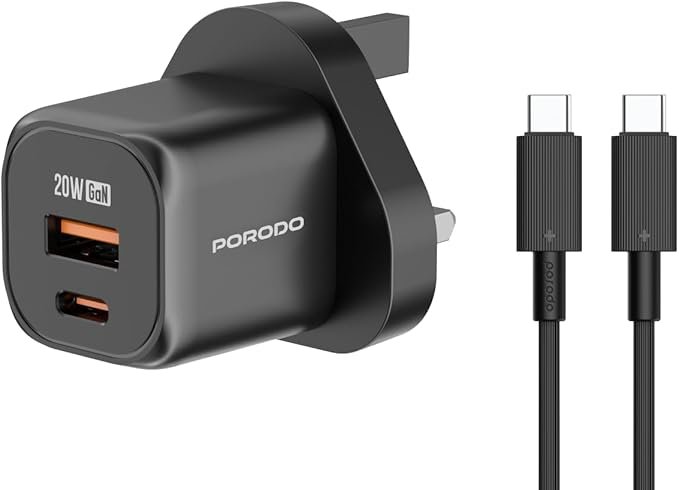 Be the first to review “Porodo (PD-FWCH028-BK-C) PD 20W USB QC3.0 UK FAST CHARGER WITH C TO C CABLE – BLACK” Cancel reply